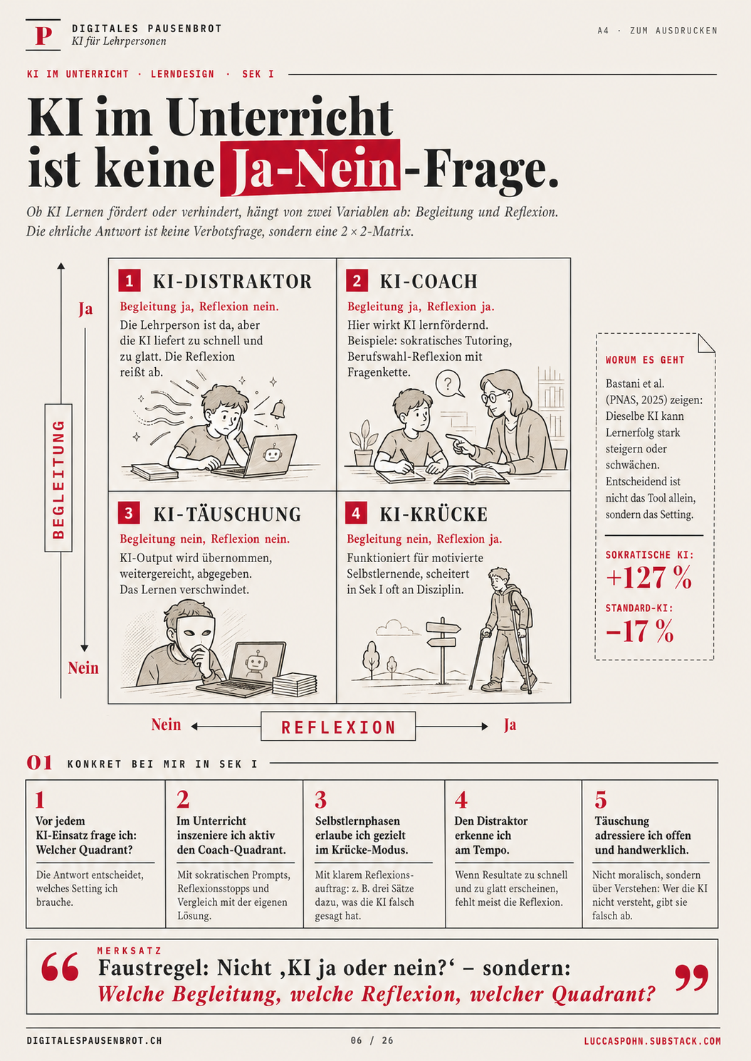 Vier Felder, vier Charaktere. KI-Coach oben rechts: Begleitung ja, Reflexion ja. Hier wirkt KI lernfördernd. Sokratisches Tutoring im Mathe-Setting. Berufswahl-Reflexion mit Fragenkette. KI-Krücke unten rechts: Begleitung nein, Reflexion ja. Die Lernende reflektiert zwar über den Output, hat aber niemanden, der die Reflexion zurückspiegelt. Funktioniert für motivierte Selbstlernende, scheitert in Sek 1 oft an Disziplin. KI-Distraktor oben links: Begleitung ja, Reflexion nein. Die Lehrperson ist da, aber die KI liefert so schnell und so glatt, dass die Reflexion abreisst. Klassisches Problem in unstrukturierten Hausaufgaben mit ChatGPT-Nutzung. KI-Täuschung unten links: Begleitung nein, Reflexion nein. Output wird übernommen, weitergereicht, abgegeben. Hier verschwindet das Lernen vollständig.